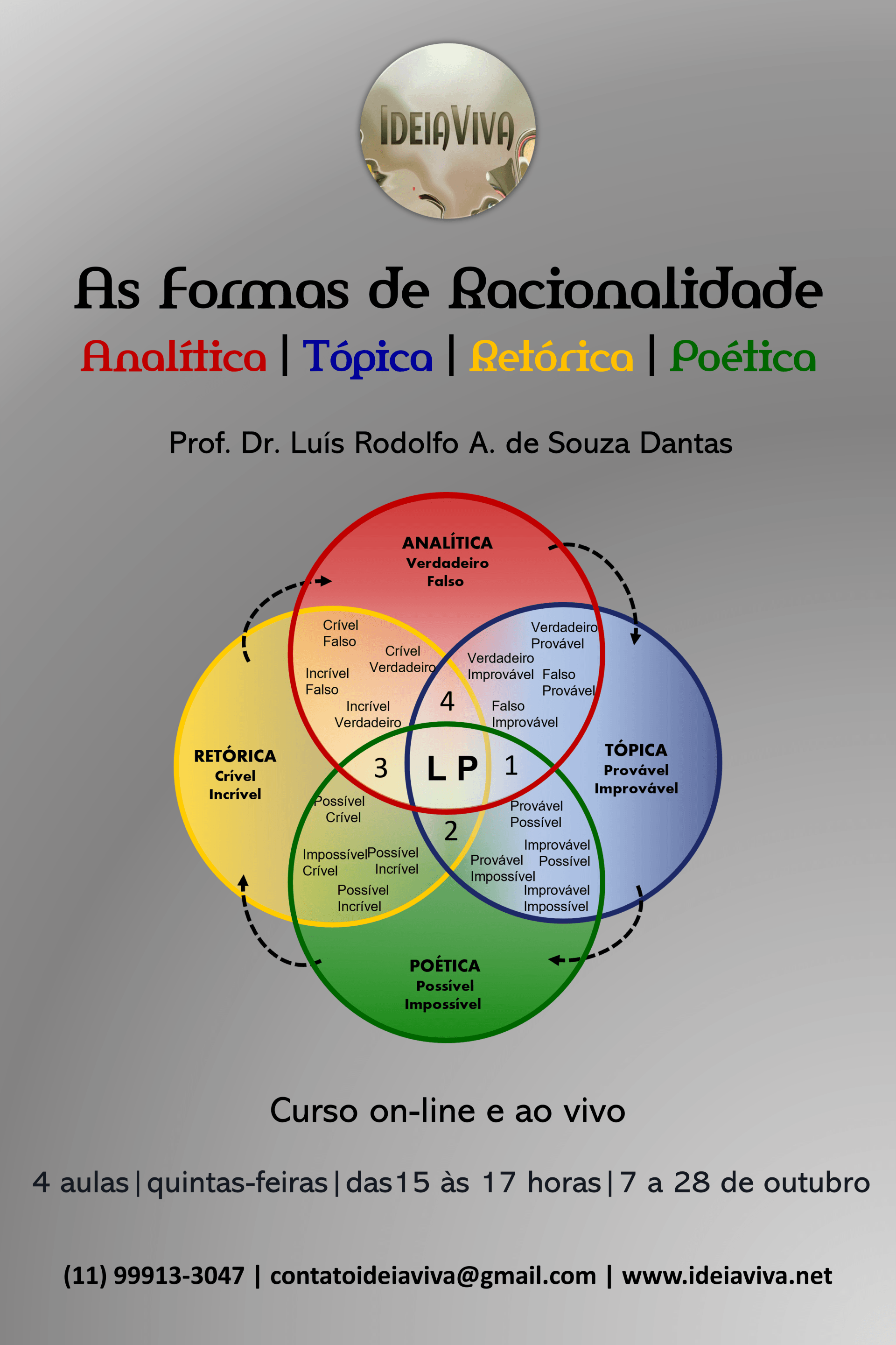 Na obra Aristotélica, Analítica, Tópica, Retórica e Poética constituem formas de racionalidade diretamente associadas a modelos de pensamento e de ação discursiva afeitos a específicas formas de se conceber, julgar e raciocinar, o que leva o estudioso a identificar diversas espécies de categorias, de juízos e proposições, de raciocínios e argumentos que, distribuídos pelos textos lógico-aristotélicos, permitem que se conclua – com embasamento em concepção de Avicena, em vista do que sustenta em Mantiq Al Mashriqiyin – a unidade destas quatro formas de racionalidade, reunidas no conceito geral de ‘Lógica’ (a Analítica seria a Lógica em sentido estrito, portanto). O objetivo maior do curso, desdobrado em quatro módulos, será o de colocar em evidência o pluralismo lógico presente nos estudos analíticos, dialéticos, retóricos e poéticos do filósofo estagirita, para propiciar aos participantes o descobrimento dos liames argumentativos que existem nas articulações entre o verdadeiro, o provável, o possível e o crível, entre outras possibilidades de combinações proposicionais.